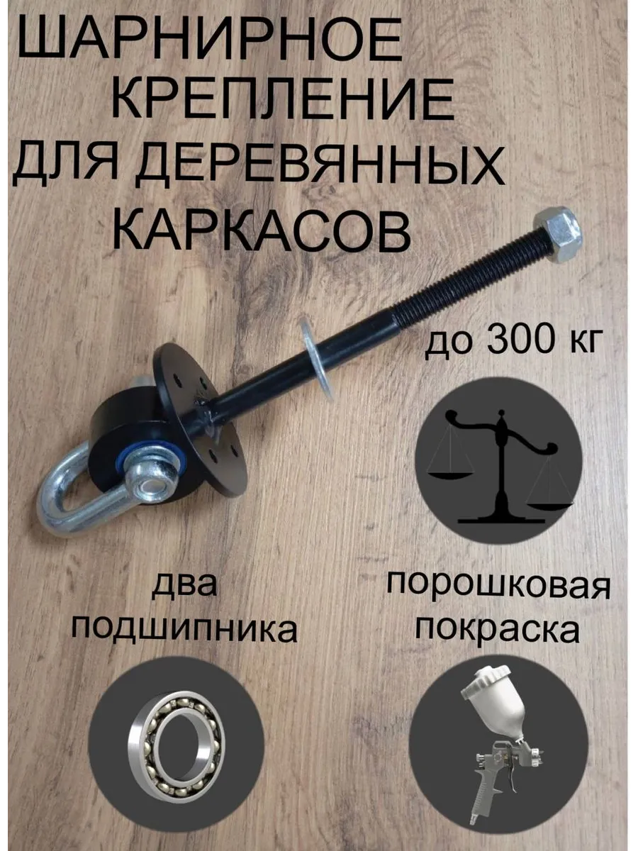 Подвес- шарнир, кронштейн данный вид крепления УНИВЕРСАЛЬНЫЙ, подходит для монтажа разных видов качелей, боксерской груши, гамака, игрового и спортивного оборудования . Металлический подвес имеет круглое основание/подошву с четырьмя круглыми отверстиями для дополнительной фиксации, на шпильке М12,длина шпильки 160 мм плоская шайба с гайкой идут в комплекте. Шарнир окрашен порошковой краской (с использованием высоких температур). На круглой подошве находится втулка с подшипниковой опорой в подвесе используется пара подшипников- это обеспечивает надежность и долговечность изделия. Такелажная скоба М12. .Монтаж осуществляется "сквозь балку" деревянного бруса, длина штыря от круглого основания 160 мм, если балка толще, то высверливается отверстие для скрытого монтажа.