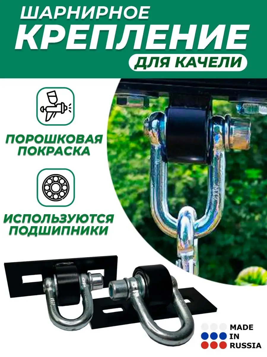 Подвесы для качелей (шарнирное крепление, подвесы для качели, крепления, кронштейны) -самый надежный вид крепления для безопасной эксплуатации качелей. Шарнирное крепление для качелей - изделие российского производства, проработано до мелочей. Места соединения металла имеют качественный, аккуратный сварной шов. Изделие имеет порошковое, полимерное покрытие - самая надежная защита от коррозии металла. Наличие подшипников исключает трение и посторонние скрипы, а сами качели плавно раскачиваются без рывков и резких торможений. Благодаря удлиненной такелажной скобе М12,качели без труда подвешиваются на карабины. Ваши качели будут висеть прочно и основательно- подвесы рассчитаны на максимальную нагрузку до 300 кг. Монтаж подвесов не займет много времени. Шарниры крепятся на болты, анкерные болты М10 (не входят в комплект).